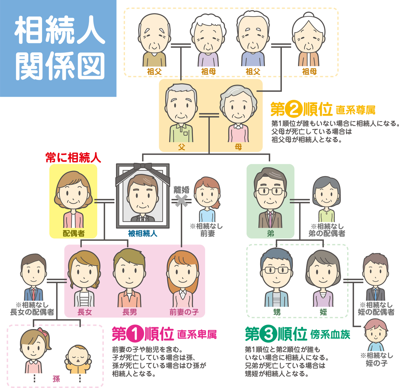 相続の優先順位は次のとおりです(相続人関係図のとおり)